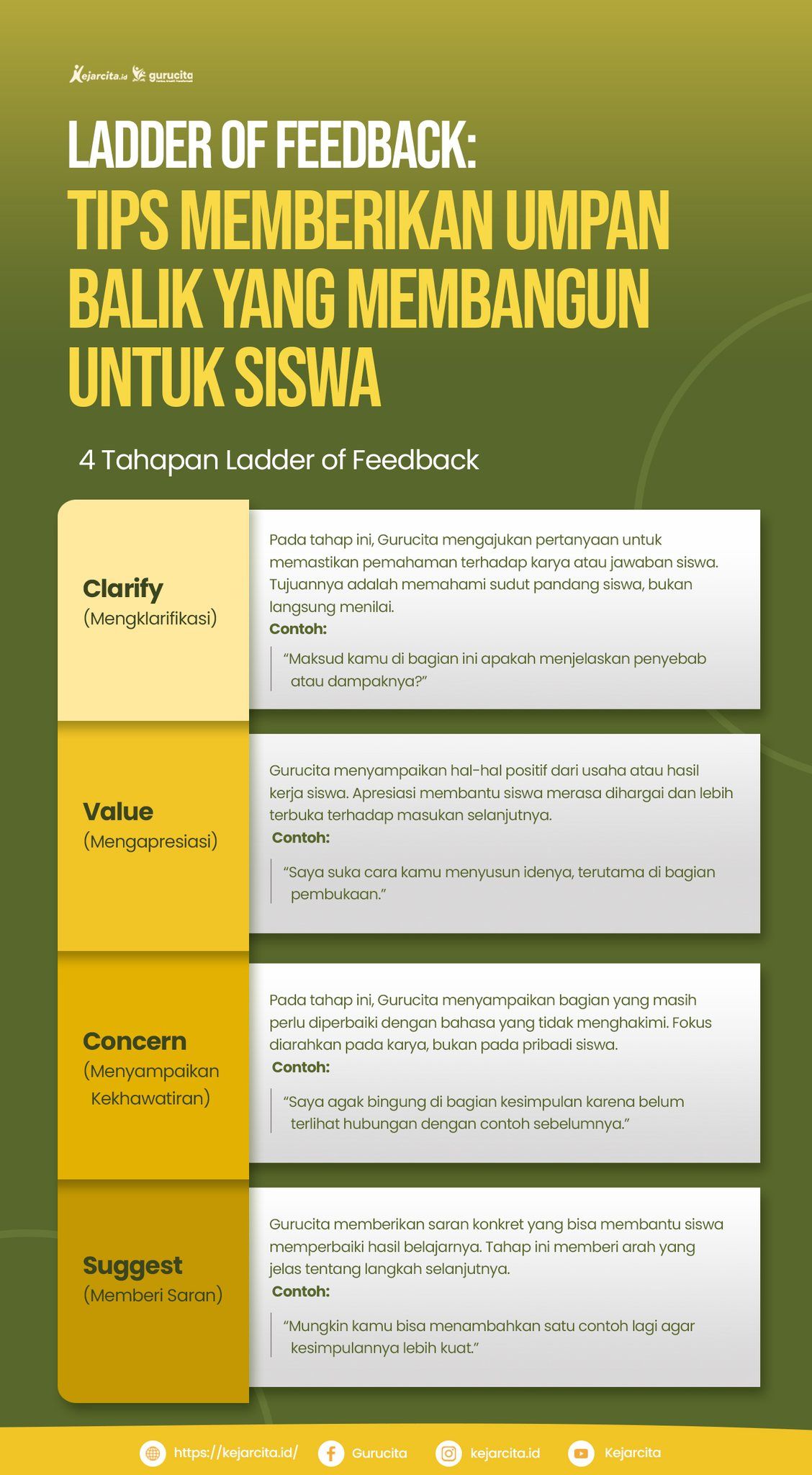 Umpan balik yang diberikan guru sebaiknya disesuaikan dengan kebutuhan masing-masing siswa. Tidak hanya berupa nilai, tetapi juga arahan yang membantu siswa memahami kekuatan dan hal yang perlu diperbaiki. Dengan feedback yang personal, siswa akan merasa diperhatikan dan lebih termotivasi untuk berkembang sesuai dengan kecepatan belajarnya.