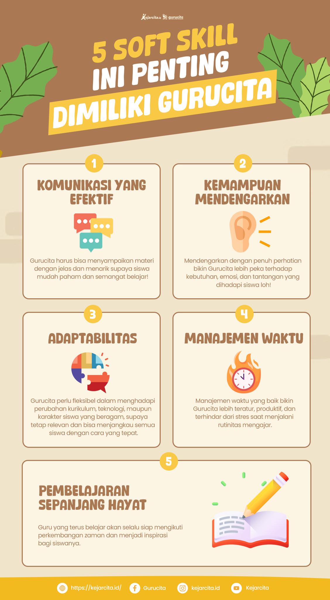 Setiap profesi membutuhkan soft skill tertentu dalam melaksanakan tugasnya. Termasuk seorang guru. Agar guru dapat terus mengajar sesuai perkembangan zaman, guru perlu menguasai beberapa soft skill tertentu. Apa sajakah itu?