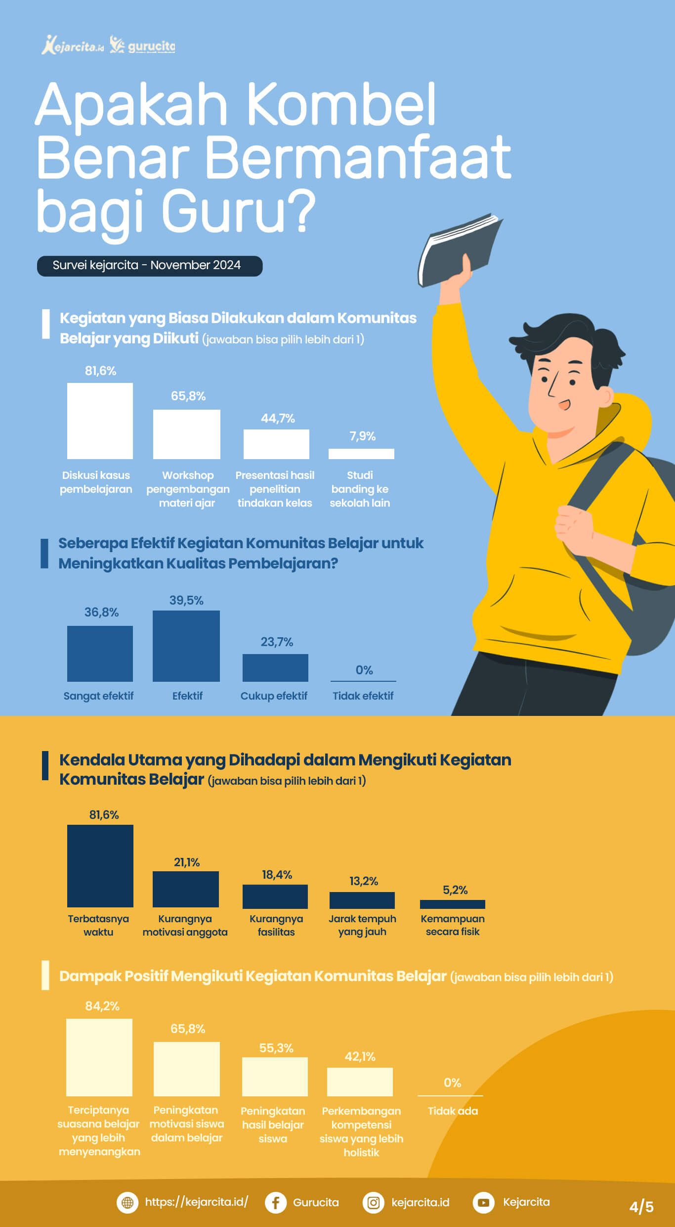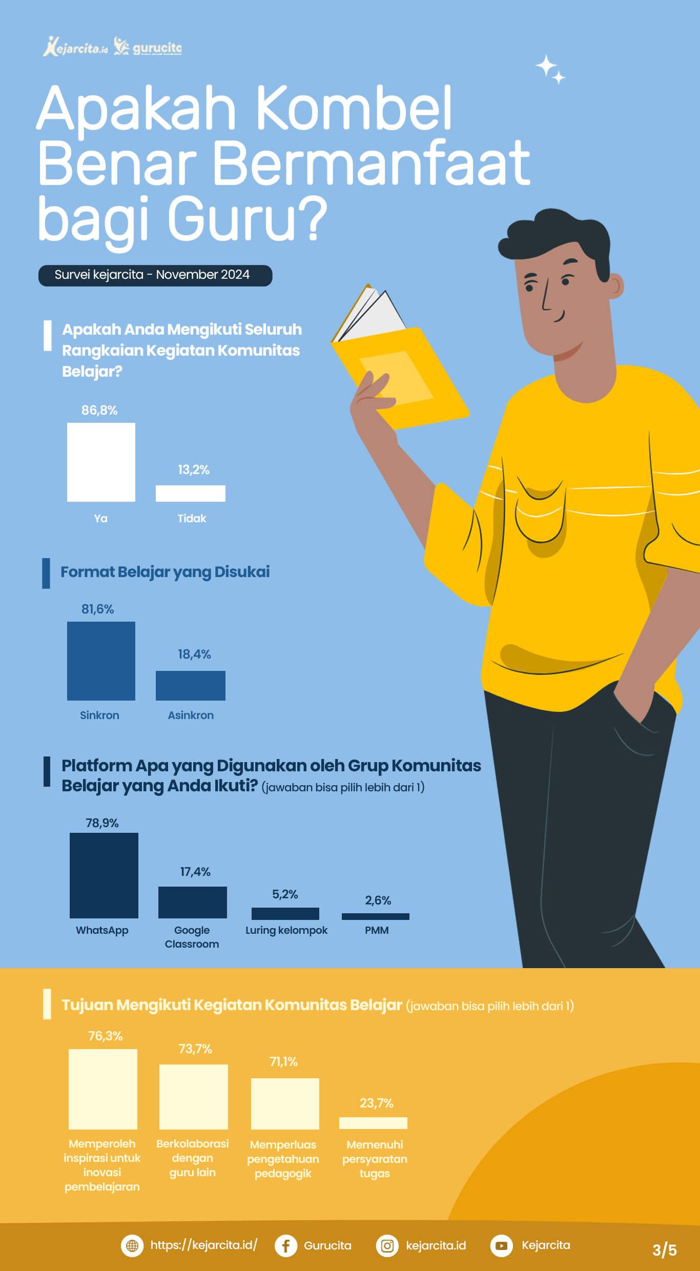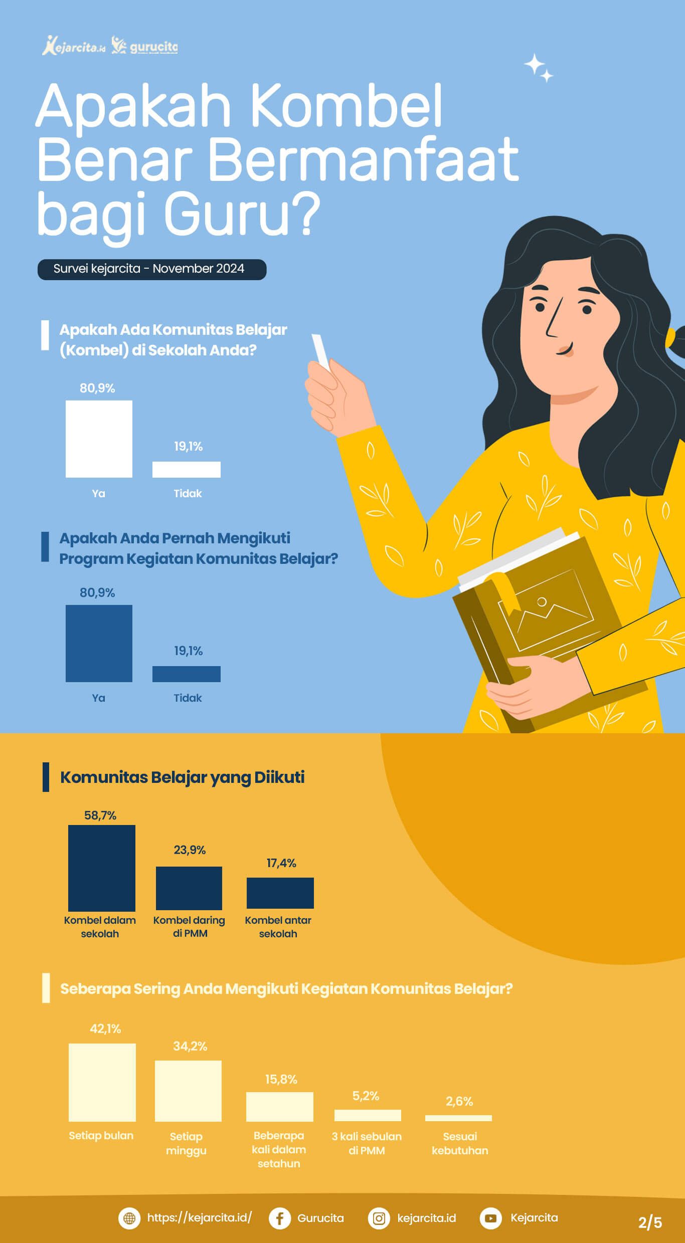 Hi bapak/ibu Gurucita! Pada November 2024, Kejarcita melakukan survei mengenai Komunitas Belajar Guru. Berikut adalah hasil surveinya!