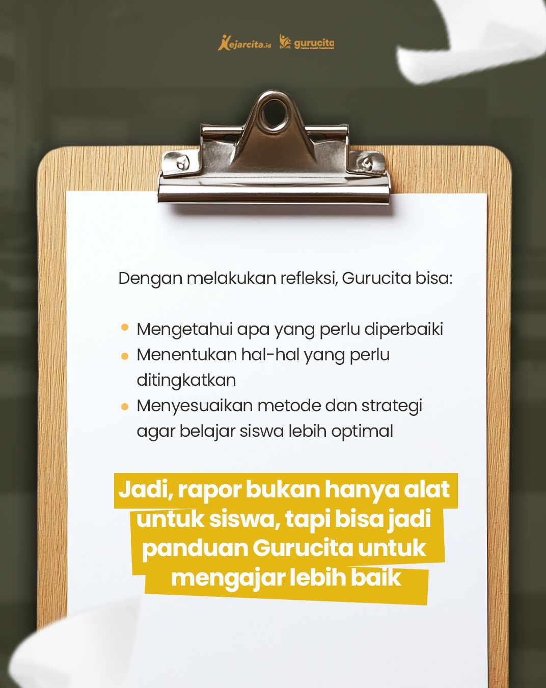 Selain menilai prestasi siswa, rapor juga bisa jadi cermin buat Gurucita loh! Gurucita jadi bisa menilai apakah metode mengajar sudah efektif, melihat sejauh mana materi tersampaikan dengan baik, dan menentukan cara memperbaiki & meningkatkan proses belajar. Yuk, simak informasinya lebih lengkap di postingan berikut!