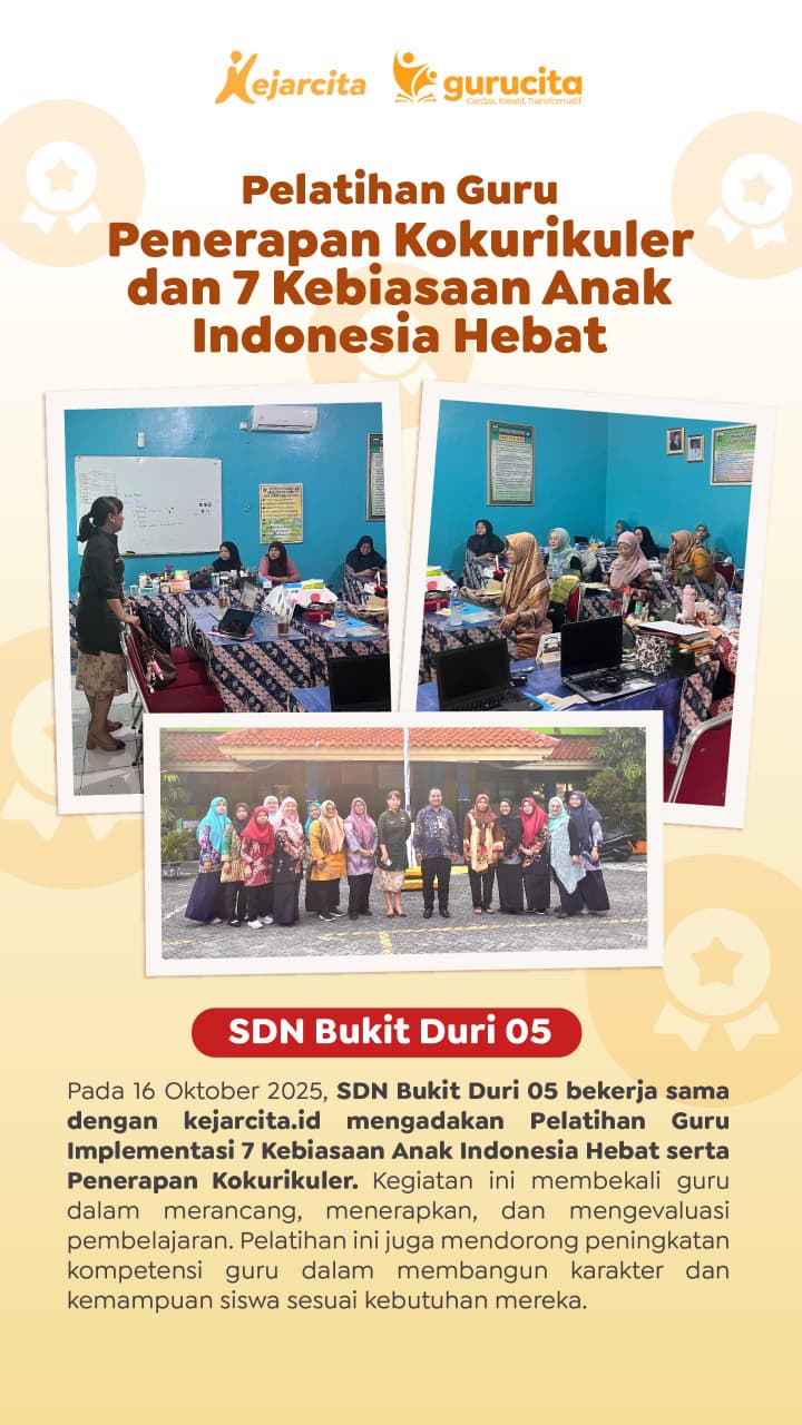 Sebagai bentuk dukungan, kejarcita telah menghadirkan berbagai pelatihan yang berfokus pada penguatan karakter dan keterampilan siswa, termasuk pelatihan pembelajaran yang mendukung pembentukan kebiasaan positif di kelas. Yuk, tingkatkan kualitas pembelajaran dan peran Anda sebagai guru dengan mengikuti program dari kejarcita. Hubungi tim kejarcita sekarang dan temukan pelatihan yang tepat untuk kebutuhan Anda!