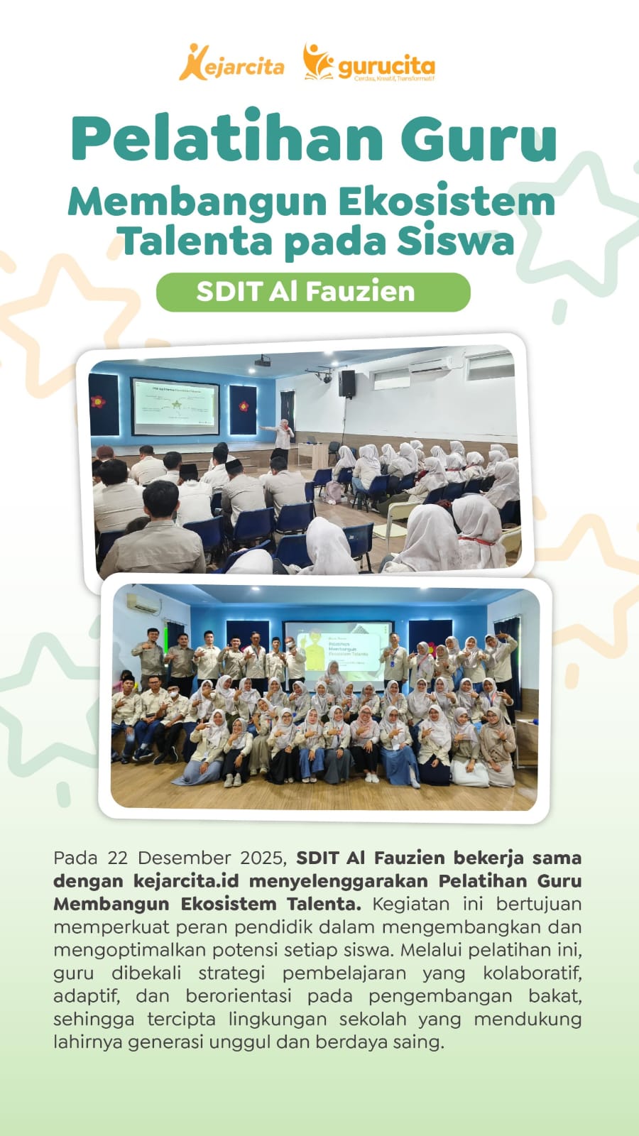 Sebagai bentuk dukungan, kejarcita telah menghadirkan berbagai pelatihan yang berfokus pada penguatan karakter dan keterampilan siswa, termasuk pelatihan pembelajaran yang mendukung pembentukan kebiasaan positif di kelas. Yuk, tingkatkan kualitas pembelajaran dan peran Anda sebagai guru dengan mengikuti program dari kejarcita. Hubungi tim kejarcita sekarang dan temukan pelatihan yang tepat untuk kebutuhan Anda!