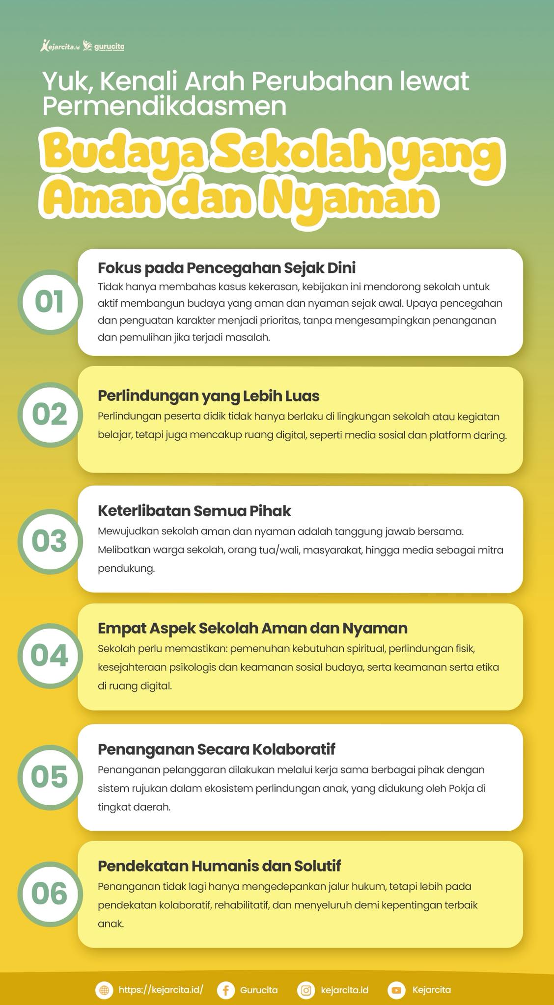 Sekolah aman, nyaman, dan inklusif merupakan konsep penting dalam menciptakan lingkungan pendidikan yang berkualitas. Sekolah aman adalah lingkungan yang terbebas dari segala bentuk kekerasan, baik fisik, verbal, maupun psikologis, sehingga siswa merasa terlindungi selama proses belajar. Sementara itu, sekolah nyaman merujuk pada kondisi yang mendukung pembelajaran secara optimal, baik dari segi fasilitas fisik yang memadai maupun suasana psikologis yang membuat siswa merasa dihargai dan tidak tertekan. Kedua aspek ini menjadi fondasi penting agar siswa dapat belajar dengan fokus dan penuh rasa percaya diri.