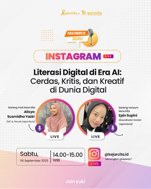 Yuk, kita ngobrol seru bareng Kak Epin Supini yang bakal bahas literasi digital di IG Live kejarcita!Catat jadwalnya, ya: