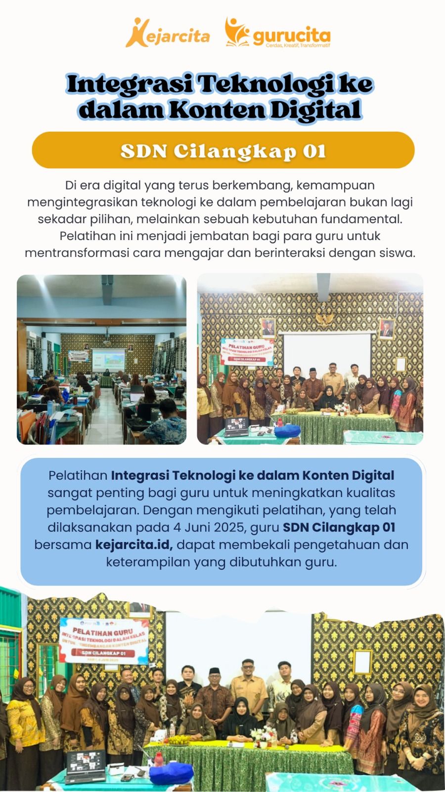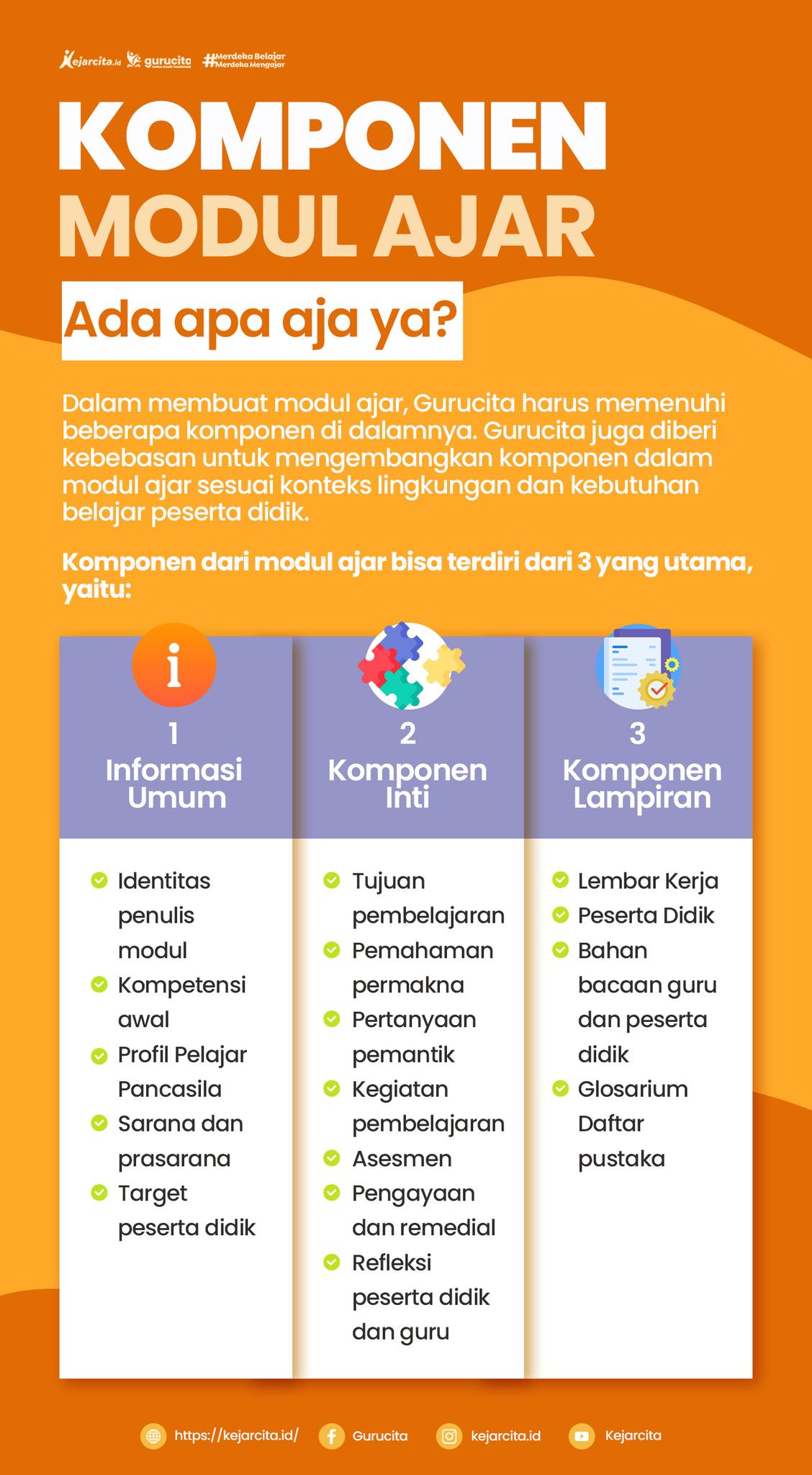Jika Anda ingin mendapatkan referensi modul ajar yang praktis dan siap digunakan, kejarcita menyediakan kumpulan modul ajar lengkap yang dapat diakses melalui website kejarcita, sehingga guru dapat lebih mudah menemukan inspirasi, mengembangkan pembelajaran, dan meningkatkan kualitas proses belajar mengajar di kelas. Selain itu, kejarcita juga mengadakan pelatihan bagi guru untuk merancang dan mengintegrasikan teknologi ke dalam pembelajaran agar lebih menarik dan inovatif, sehingga jika Anda tertarik mengembangkan pembelajaran berbasis teknologi, Anda dapat langsung menghubungi kejarcita untuk mendapatkan pendampingan yang tepat, ya!