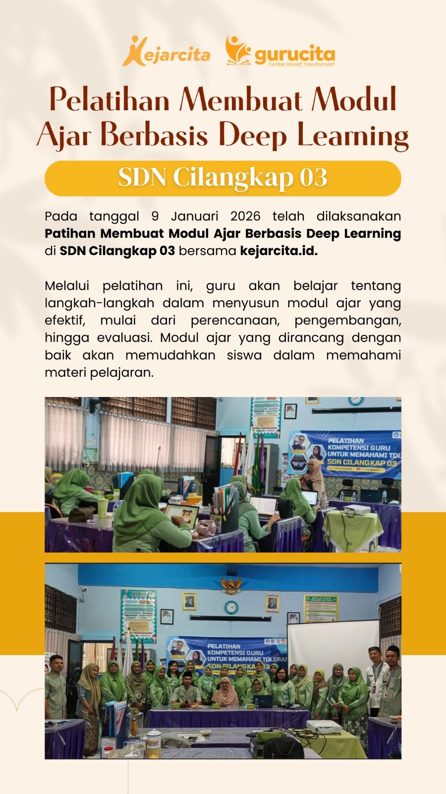 Model pembelajaran deep learning merupakan pendekatan pembelajaran yang membantu siswa memahami materi secara lebih mendalam melalui keterlibatan aktif, pemecahan masalah, serta pengaitan materi dengan kehidupan nyata. Pendekatan ini tidak hanya meningkatkan kemampuan berpikir kritis dan kreativitas siswa, tetapi juga membantu guru menciptakan pembelajaran yang lebih inovatif, interaktif, dan bermakna. Agar penerapannya semakin optimal, guru tentu membutuhkan dukungan pelatihan dan sumber belajar yang praktis. Melalui program pelatihan deep learning dan penyediaan modul ajar yang sistematis serta mudah digunakan, kejarcita hadir untuk membantu guru menerapkan pembelajaran yang lebih efektif, sehingga proses belajar mengajar dapat berjalan lebih menarik, terarah, dan sesuai dengan kebutuhan pendidikan masa kini.