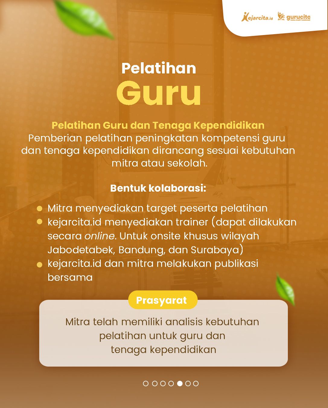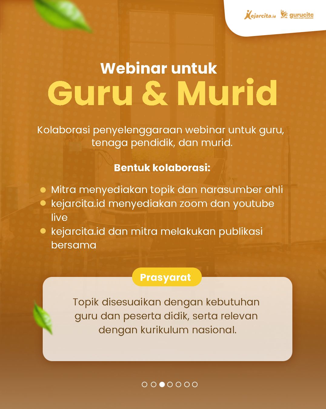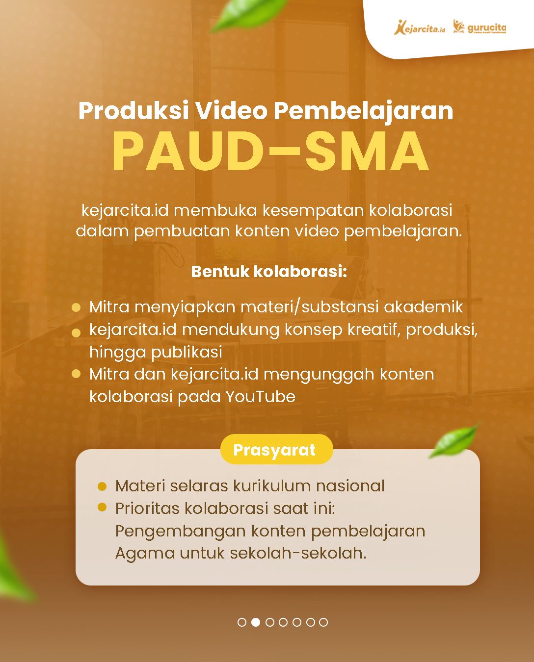 kejarcita membuka peluang kolaborasi dengan berbagai mitra untuk menghadirkan pembelajaran yang lebih luas dan bermakna. Mulai dari produksi video pembelajaran, penyelenggaraan webinar edukatif, hingga pelatihan untuk siswa dan guru.Kami terbuka untuk berkolaborasi dengan yayasan atau institusi pendidikan, komunitas guru, NGO, program CSR perusahaan, hingga pelaku EdTech.Mari ciptakan lebih banyak akses belajar dan dampak positif bersama.