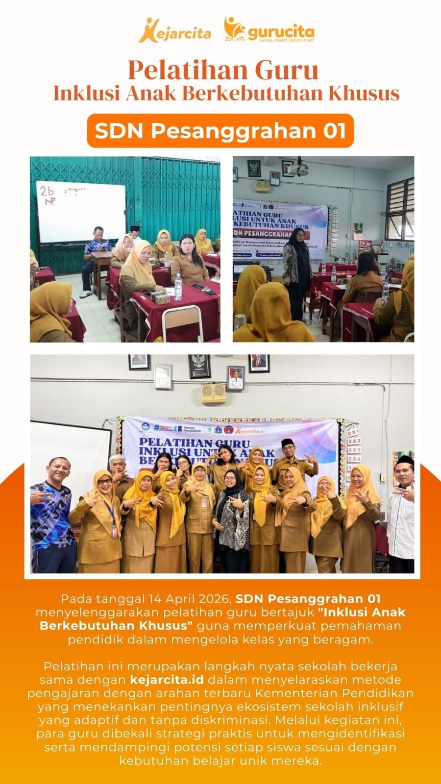 Selain itu, kejarcita juga telah berpengalaman dalam menyelenggarakan pelatihan pendidikan inklusi bagi guru, sehingga dapat membantu meningkatkan kompetensi dalam menciptakan lingkungan belajar yang lebih ramah dan efektif. Dengan dukungan yang tepat, guru tidak hanya mampu menerapkan pendidikan inklusi dengan baik, tetapi juga berkontribusi dalam menciptakan sistem pendidikan yang lebih adil dan berkualitas bagi semua peserta didik.