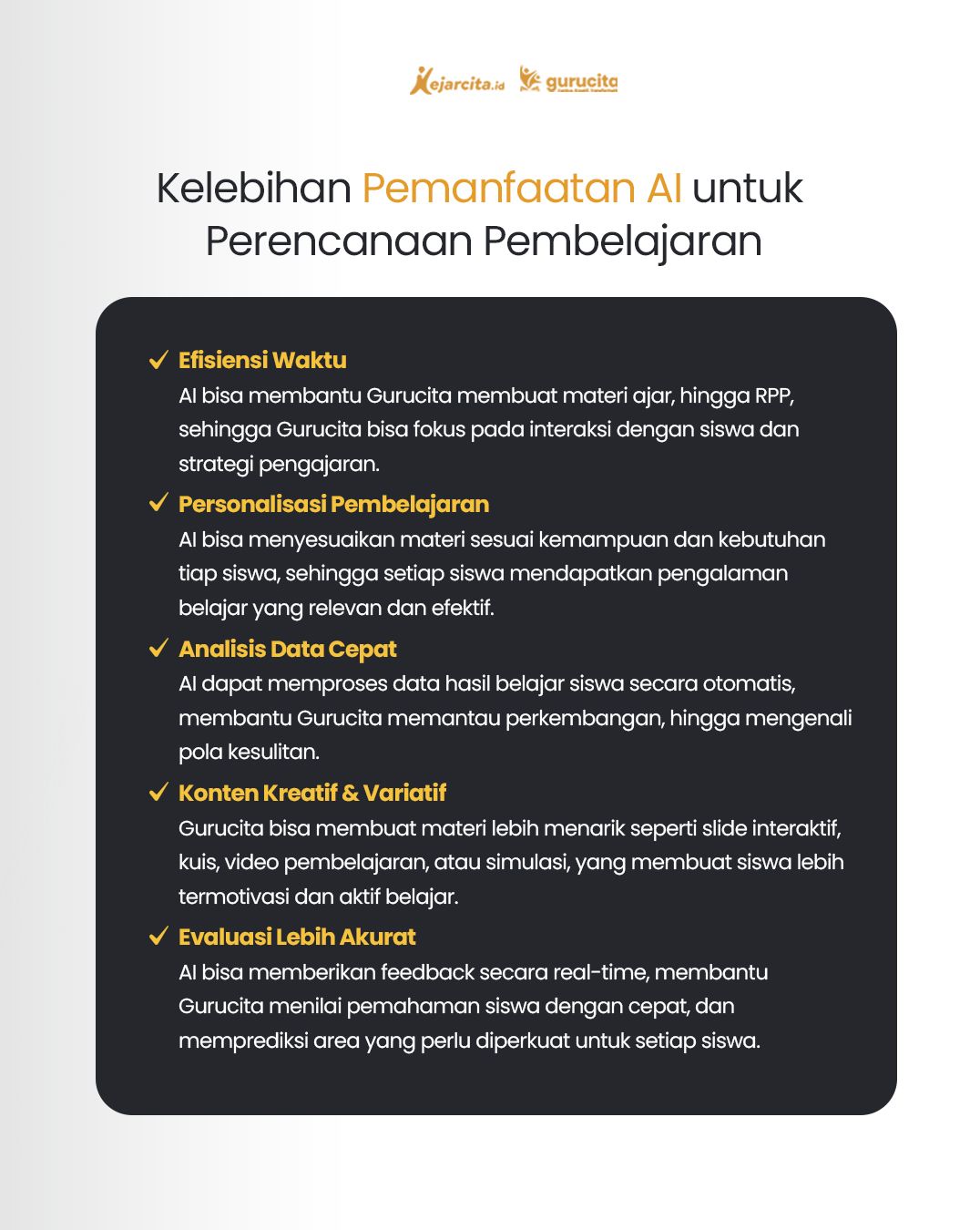 Guru dapat memanfaatkan AI untuk mendukung tugas-tugas guru dan pengelola pendidikan, seperti analisis hasil belajar, pemantauan perkembangan siswa, serta pengelolaan administrasi akademik. Kehadiran AI membantu mengurangi beban kerja administratif guru, sehingga mereka dapat lebih fokus pada aspek pedagogis dan interaksi dengan peserta didik. Dengan demikian, perkembangan AI dalam pendidikan tidak hanya berperan sebagai inovasi teknologi, tetapi juga sebagai sarana strategis untuk meningkatkan kualitas pembelajaran dan kinerja guru di era digital.