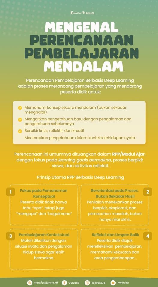 Pendekatan pembelajaran mendalam (deep learning) hadir sebagai alternatif untuk meningkatkan kualitas perencanaan pembelajaran. Pendekatan ini menekankan pentingnya pemahaman bermakna, keterlibatan aktif siswa, serta pengembangan kemampuan berpikir tingkat tinggi. Melalui pendekatan pembelajaran mendalam, guru tidak hanya merancang apa yang akan diajarkan, tetapi juga bagaimana siswa membangun pemahaman, mengaitkan konsep, dan merefleksikan proses belajarnya.