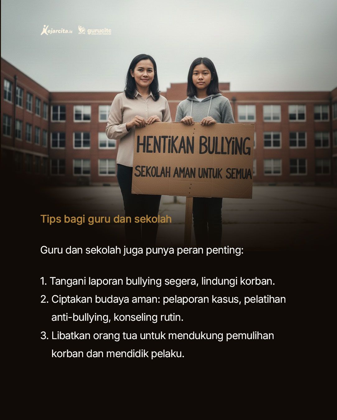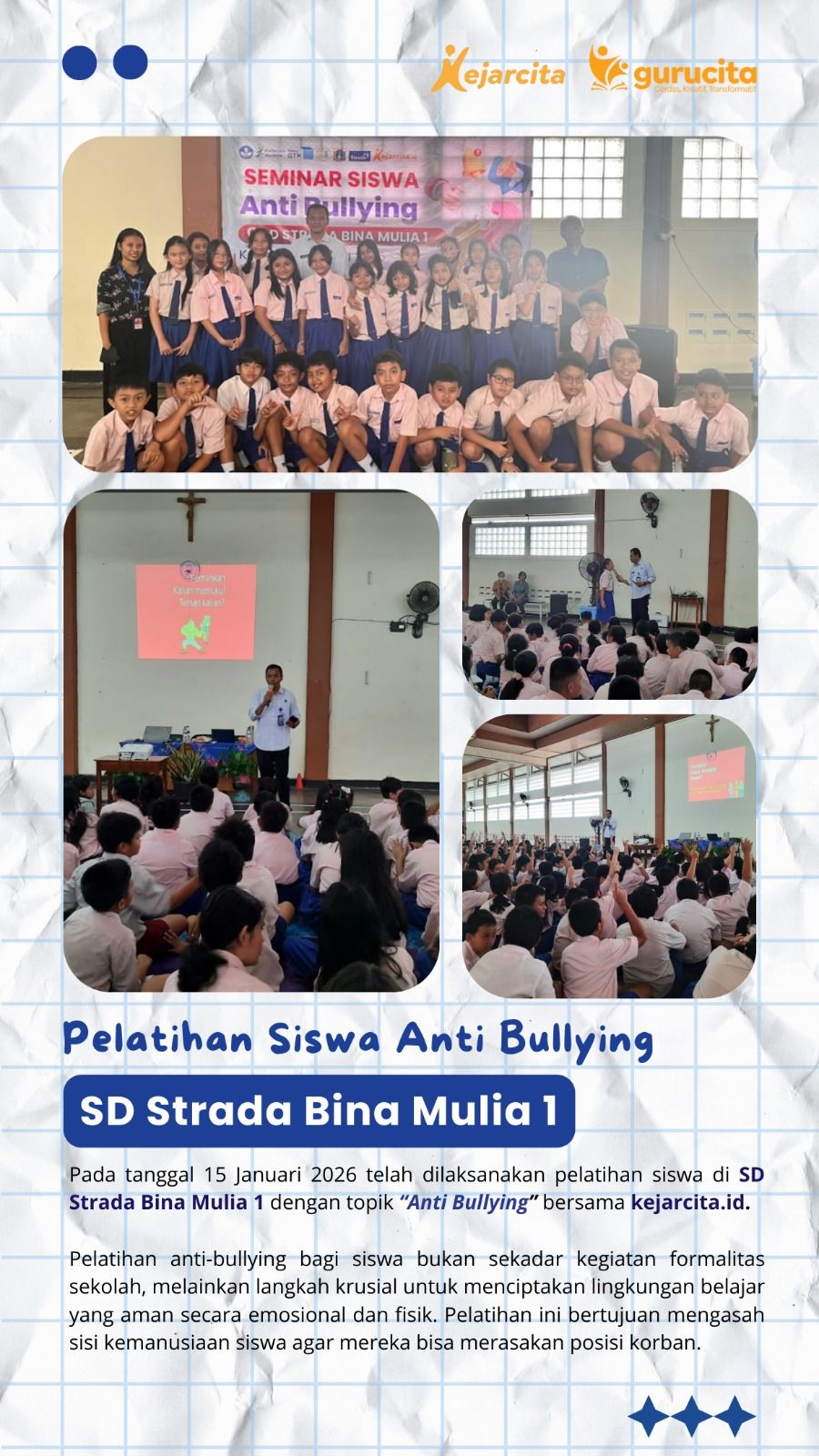 Bullying merupakan permasalahan serius yang dapat memberikan dampak negatif bagi korban, pelaku, maupun lingkungan sekolah secara keseluruhan. Terjadinya bullying dipengaruhi oleh berbagai faktor, mulai dari faktor individu, keluarga, lingkungan sekolah, hingga pengaruh teman sebaya dan media sosial. Oleh karena itu, pencegahan bullying memerlukan peran aktif dari sekolah dalam menciptakan kebijakan, lingkungan yang aman, serta program edukasi yang berkelanjutan, sekaligus dukungan teman sebaya dalam menumbuhkan empati, memberikan perlindungan, dan menciptakan pertemanan yang sehat. Untuk mendukung upaya tersebut, kejarcita juga menyediakan program pelatihan anti-bullying yang dapat membantu sekolah, guru, dan siswa dalam membangun lingkungan belajar yang lebih aman dan nyaman. Bagi sekolah atau pihak yang ingin mendapatkan informasi lebih lanjut mengenai program pelatihan ini, dapat menghubungi admin kejarcita untuk konsultasi dan kerja sama lebih lanjut.