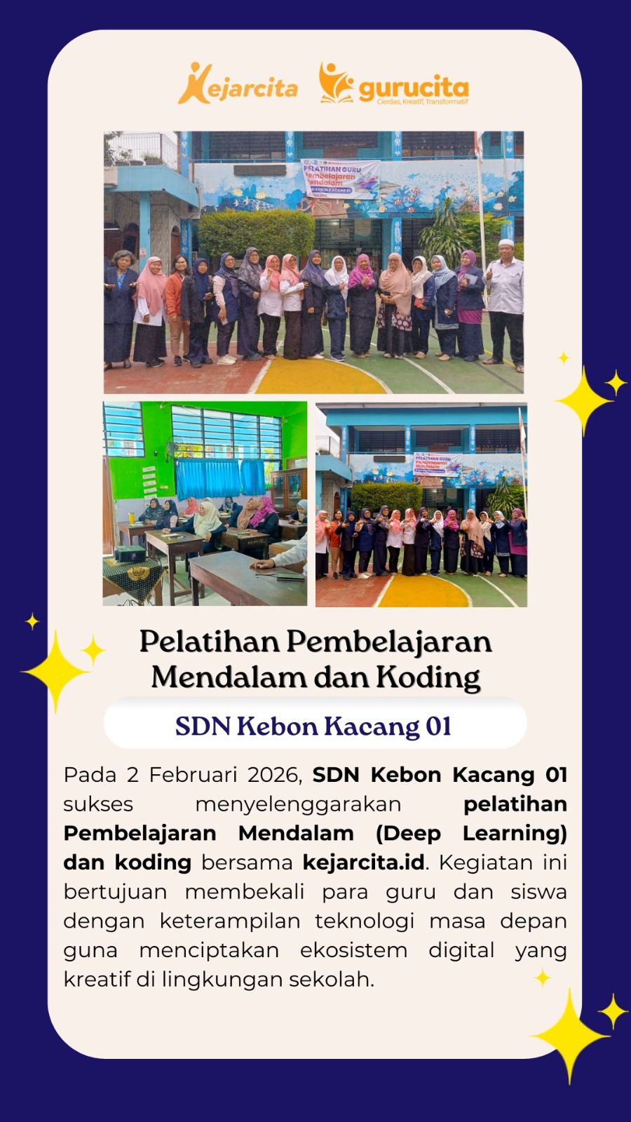 Sebagai bentuk dukungan terhadap transformasi pendidikan, kejarcita juga telah menyelenggarakan pelatihan deep learning bagi pendidik untuk membantu guru memahami konsep sekaligus praktik implementasinya di kelas, sehingga sekolah dapat mulai menerapkan pembelajaran mendalam secara bertahap dan berkelanjutan.