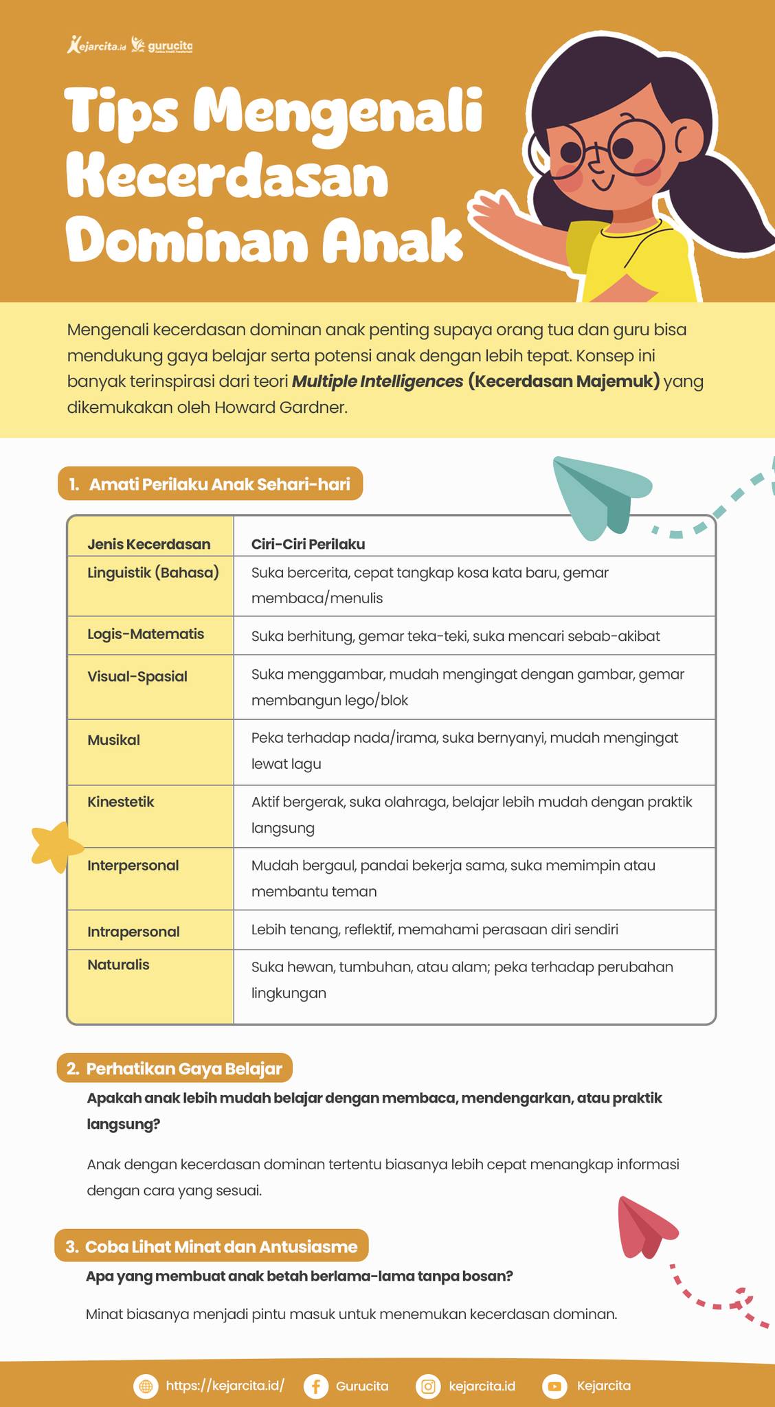 Gurucita, setiap anak itu unik! Mereka punya kecerdasan dominan yang berbeda-beda, ada yang kuat di bahasa, musik, sampai logika. Sebagai orang tua & pendidik, tugas kita bukan menyamakan mereka, tapi mengenali keistimewaan masing-masing, lalu mendukungnya supaya berkembang optimal.