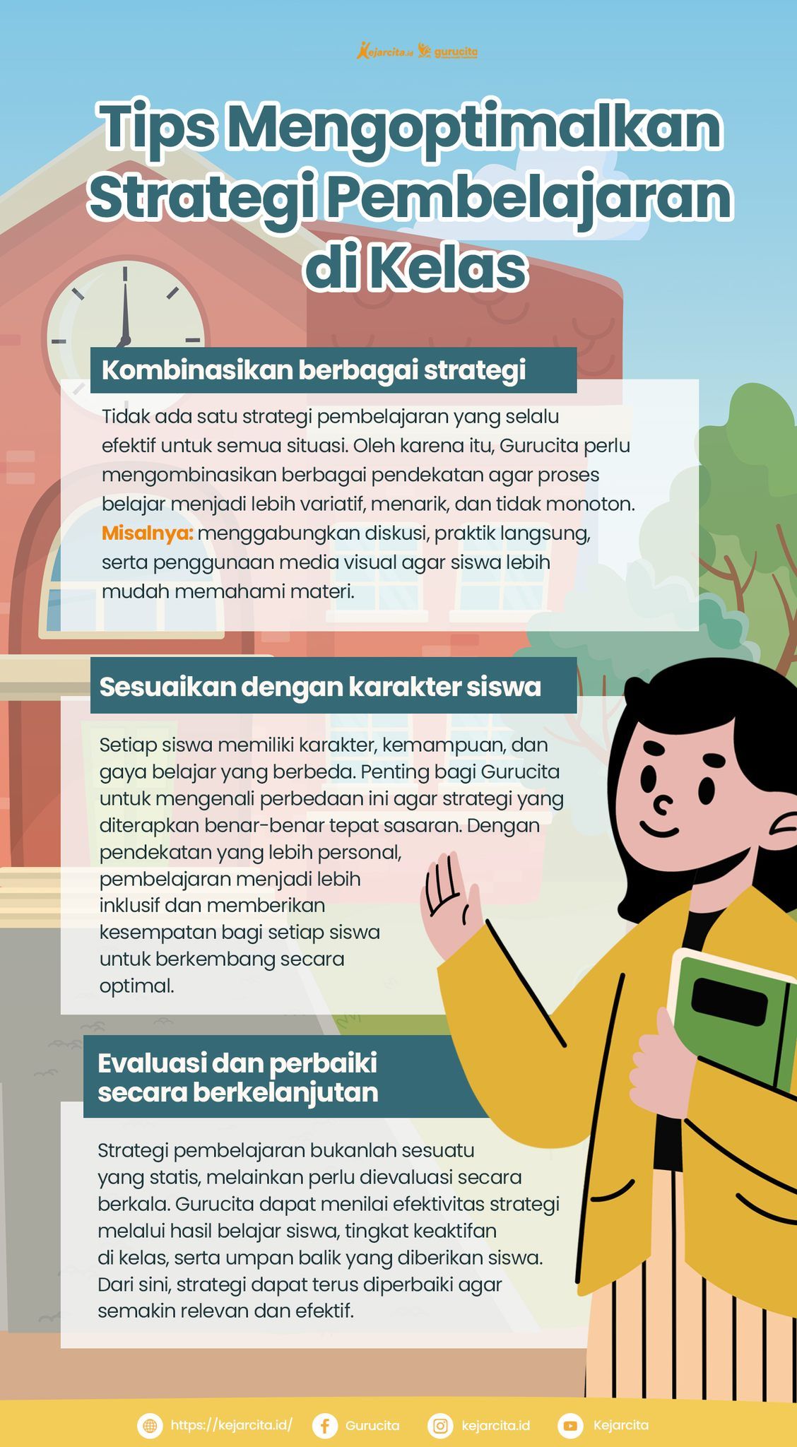 Gurucita, strategi pembelajaran yang efektif memegang peranan penting dalam meningkatkan pemahaman siswa loh. Dengan strategi yang tepat, proses belajar tidak lagi sekadar menghafal, tapi bisa menjadi pengalaman yang lebih bermakna, aktif, dan aplikatif.Nah, kejarcita punya beberapa tips untuk membantu Gurucita mengoptimalkan strategi pembelajaran di kelas. Yuk, simak tips lengkapnya di postingan ini!